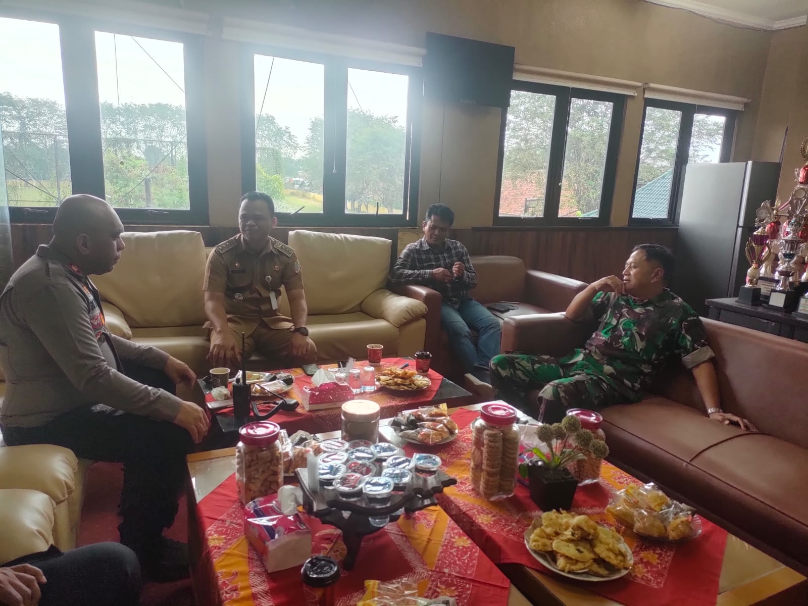 Bertempat di ruang Kerja Camat Tambun Selatan di jalan Sultan Hasanudin Desa Tambun Kecamatan Tambun Selatan Kabupaten Bekasi,Kapolsek Tambun Kompol Stanlly Soselisa Sik di samping beberapa anggotanya di terima langsung camat tambun Junaedi dan danramil 01 tambun Mayor CHB Daya Bakir.
