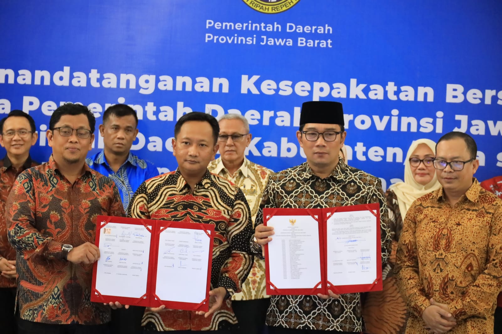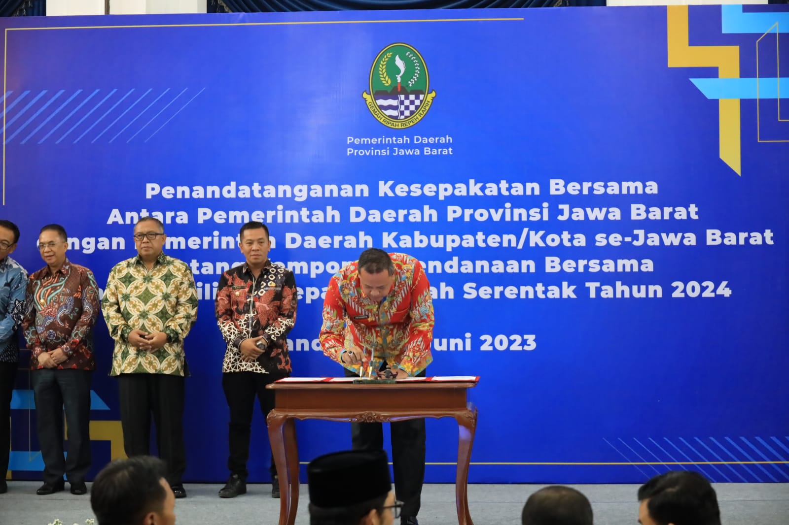 Bandung – Bertempat di Aula Gedung Sate, Kota Bandung, Gubernur Jawa Barat Ridwan Kamil, bersama Kepala Daerah se- Provinsi Jawa Barat, tandangani Naskah Kesepakatan Bersama Tentang Komitmen Pendanaan Bersama pada Pemilihan Kepala Daerah Serentak Tahun 2024, Rabu (21/06).