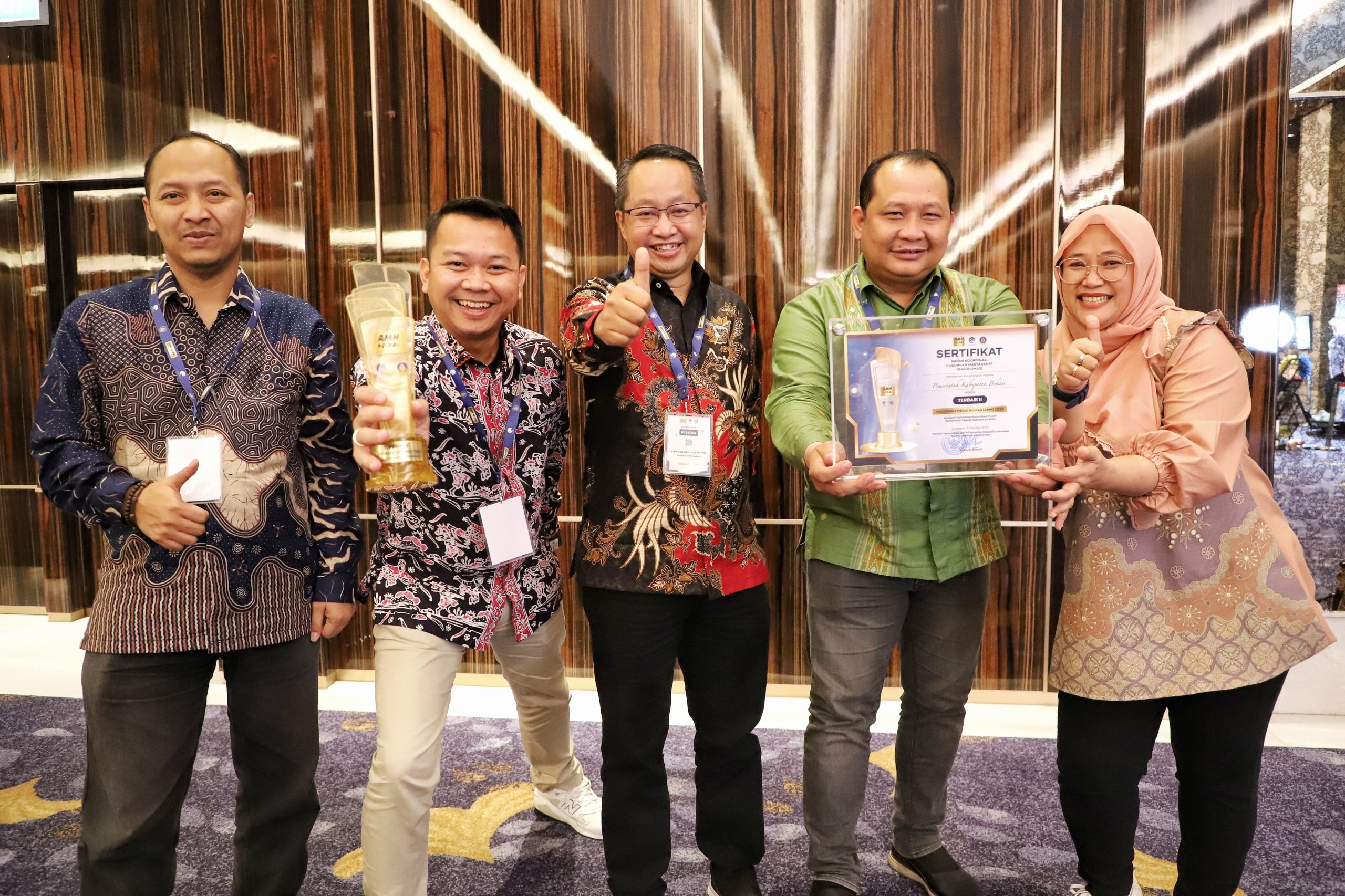 Surabaya – Dinas Komunikasi Informatika Persandian dan Statistik (Diskominfosantik) Kabupaten Bekasi berhasil meraih Juara Terbaik II tingkat nasional di ajang Anugerah Media Humas (AMH) tahun 2023 untuk kategori Kampanye Komunikasi Publik.