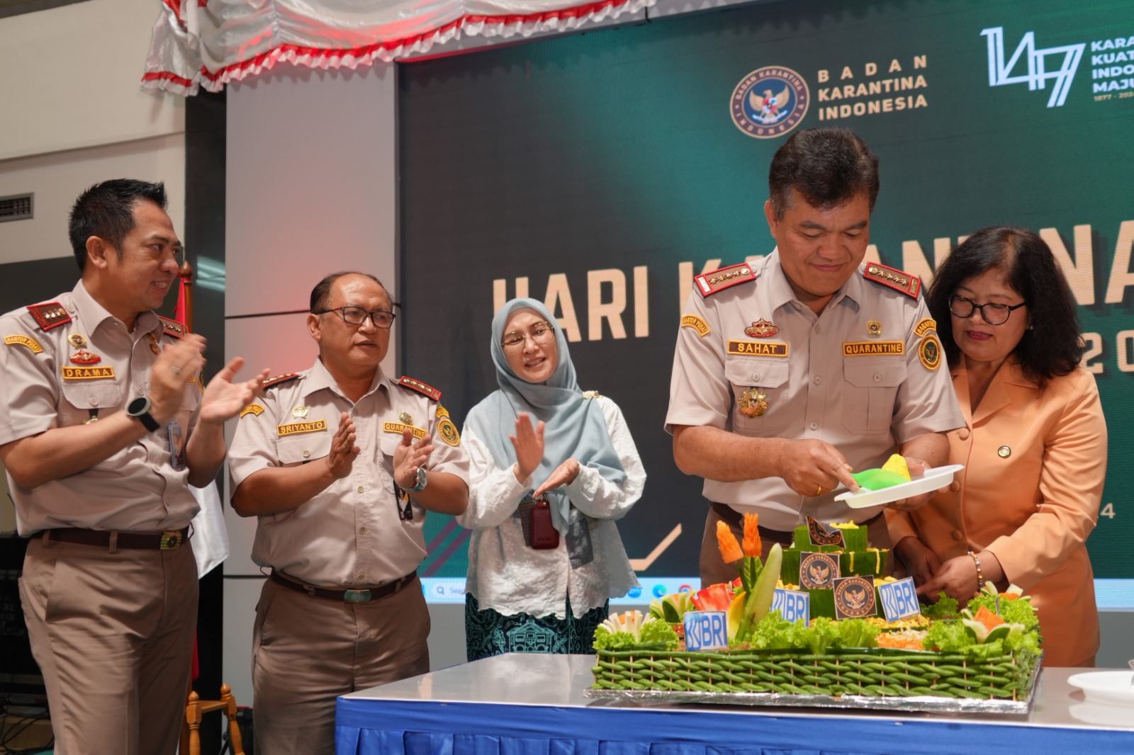 “Sistem Karantina telah hadir 147 tahun yang lalu di Indonesia. Berawal dari pencegahan pemasukan tanaman dan biji kopi asal Sri Lanka yang saat itu terkena penyakit karat daun, pada tahun 1877 lalu. Sistem ini berlangsung hingga kini, di mana negara hadir memberikan perlindungan terhadap keanekaragaman hayati di Indonesia terhadap ancaman hama dan penyakit, baik untuk hewan, ikan, maupun tumbuhan,” ujar Sahat M. Panggabean Kepala Badan Karantina Indonesia sesuai upacara puncak Hari Karantina Ke-147 di halaman Balai Uji Terap Teknik dan Metode Karantina Hewan, Ikan, dan Tumbuhan, Bekasi, Jumat (18/10).