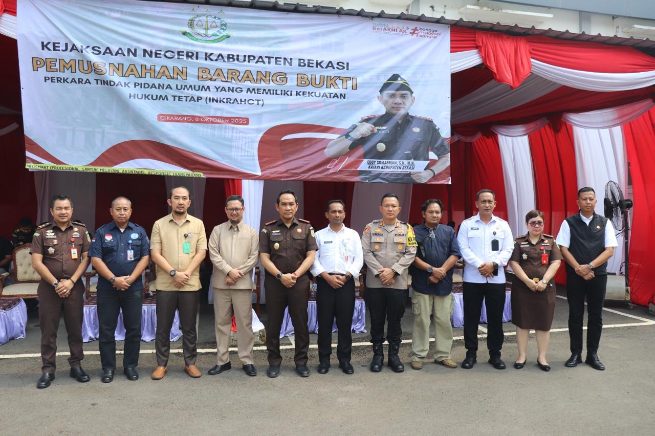 Kabupaten Bekasi – Kejaksaan Negeri Kabupaten Bekasi kembali memusnahkan barang bukti (Barbuk) hasil tindak kejahatan. Barbuk yang dimusnahkan tersebut sudah memiliki kekuatan hukum tetap atau sudah inkrah.