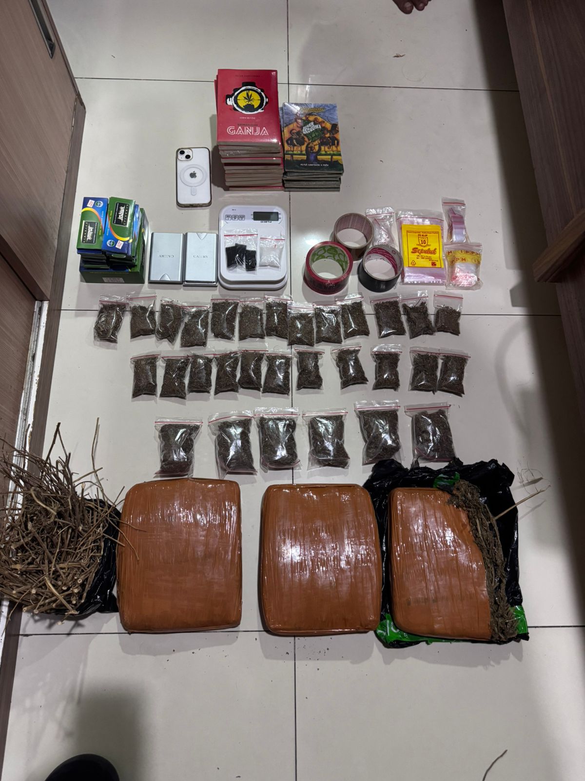 Dari tangan pelaku, polisi menyita narkotika jenis sabu seberat bruto 18,23 gram serta ganja dengan total berat bruto 3.118 gram atau lebih dari 3 kilogram. Selain itu, petugas juga mengamankan tiga unit timbangan digital, satu unit telepon genggam, plastik klip, lakban, kertas papir, serta buku panduan terkait ganja yang diduga digunakan untuk mendukung aktivitas peredaran.